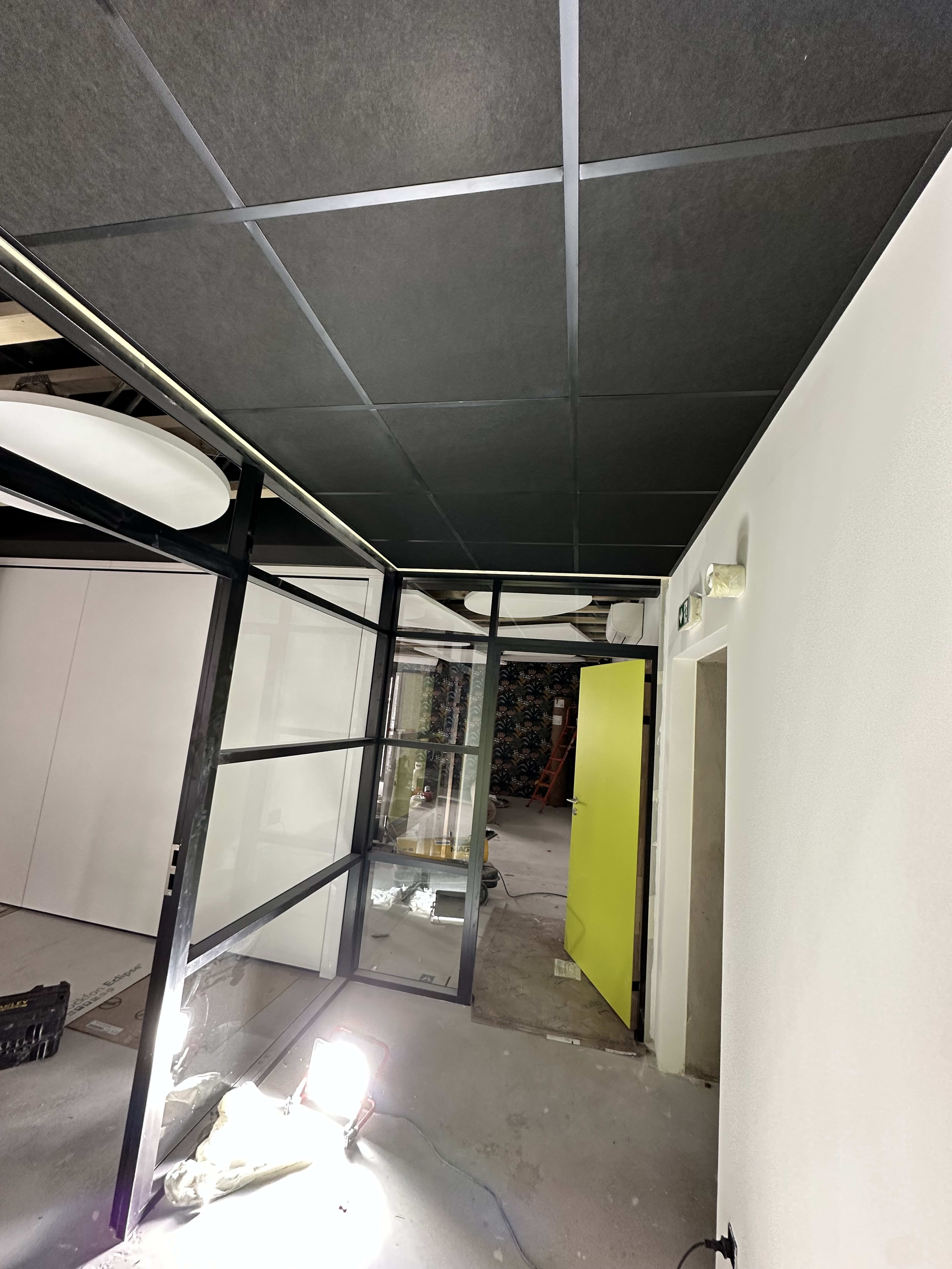 Conception et pose de faux plafonds, éclairage intégré et solutions acoustiques.